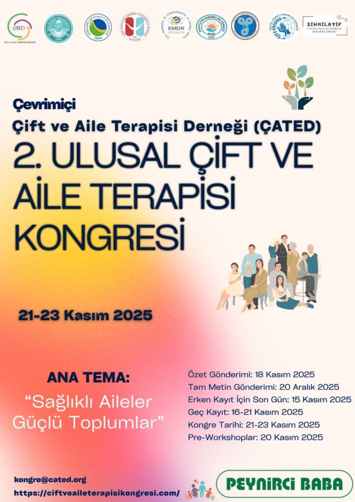ÇATED Çift ve Aile Terapisi Derneği tarafından düzenlenecek olan 2. Ulusal Çift ve Aile Terapisi Kongresi, 21–23 Kasım 2025 tarihleri arasında çevrimiçi olarak gerçekleştirilecektir. Bu yılın ana teması “Sağlıklı Aileler Güçlü Toplumlar” olarak belirlenmiştir.